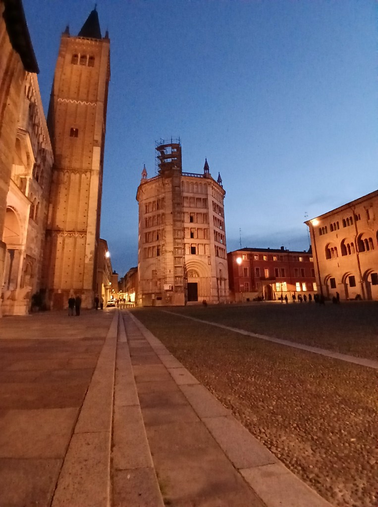 Parma’s Piazza Duomo is of another time. It is empty of all modern comforts and technologies, missing even the awnings and tables of bars that line most Italian city piazze. One imagines hooded monks scurrying across the square to deal with urgent ecumenical business.