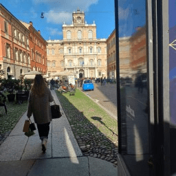 Many of Bologna’s familiar scenes are here too. You can spend half an hour orbiting the piazze on narrow yard-like streets that look just like Via delle Tovaglie or its neighbours in the South of Bologna’s old town. These are murky, musky places where you rarely pass another soul. Narrow lanes with high buildings casting their shade from either side. The walls are yellow with a visible baked ceramic quality. The porticos are often cracked, misaligned, and mismatched, and if you stare down one, they are rarely straight, but usually slink off round an accidental bend. fitting Their floors are sometimes pretty mosaics or patterned tile, but equally often are made of patches of grey concrete slapped-down in a hurry. The frontages of the buildings, hooded in the porticos’ shade, are autumnal-coloured stucco, but the walls are uneven and wonky, taking on the quality of sand dunes whittled and smoothed by wind. These lanes often smell gently of sewage or municipal bins. You are truly alone on these streets, and they invite you to walk slowly, past the signs of nearby human life; the odd parked car or populated washing line are like museum artefacts, only suggesting the presence of life.